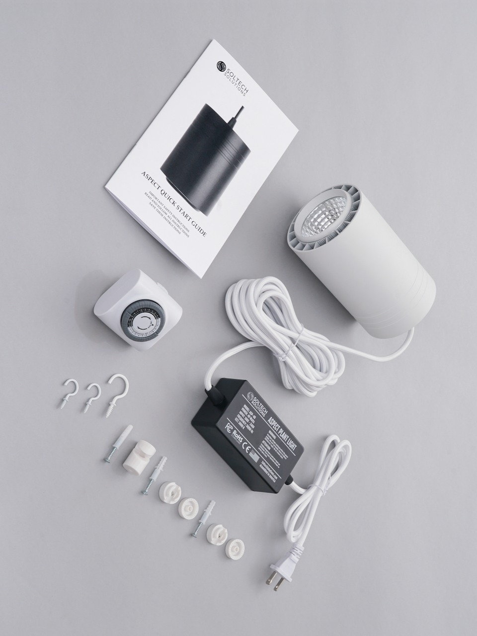 The Aspect is a complete LED grow light fixture that supports the growth of your plants by creating the perfect light for growing your plants indoors, while illuminating your space with brilliant, warm white ambient light, so no intense whites, yellows or pinks with this one - it looks like the light from a regular bulb!